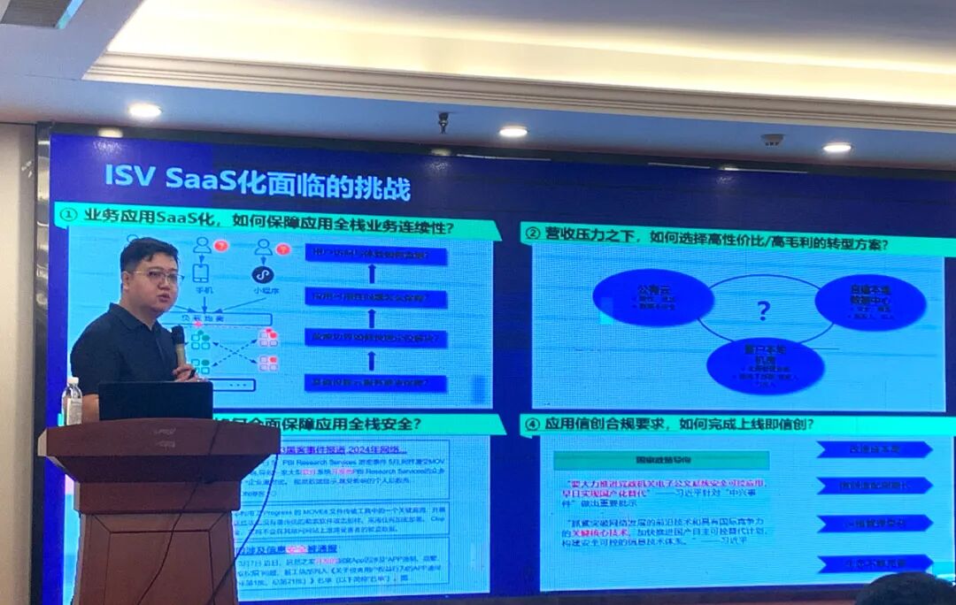 在数字化时代,企业转型已成为发展的必由之路。深信服云计算专家史宇航,凭借其丰富的行业经验和前瞻性视角,为参与者讲述第三个主题《线上线下一朵云,助力SaaS化转型降本增效》,解读云计算如何为企业的SaaS化转型提供强有力的支持,如何通过构建统一的云平台,实现资源的高效利用和成本的显著降低。