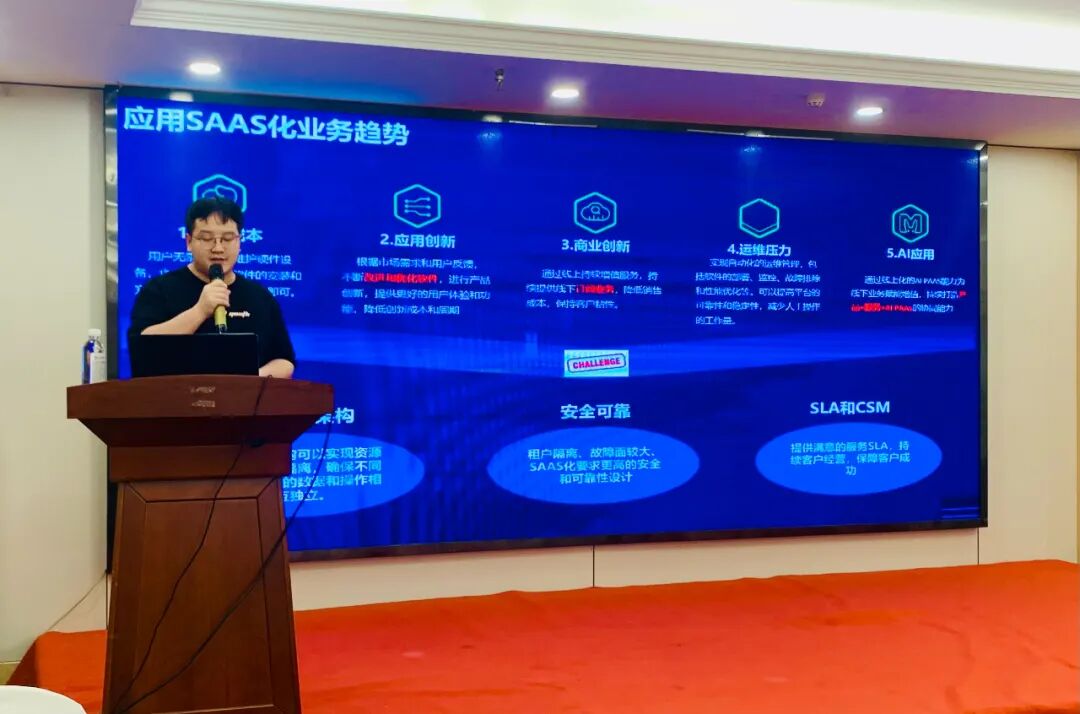 第二个主题由深信服云计算资深专家程康通过应用SAAS化关键障碍、SAAS化转型的技术路线、SAAS化与云原生技术架构、公共技术服务体系四个方面为参会者详细讲解了《SaaS化转型的技术架构设计及安全性、稳定性保障》。